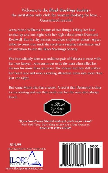 Anna Marie Williams dreams of two things: Telling her boss to shut up and one night with her high school crush Desmond Rockwell. But the shy human resources employee doesn't expect either to come true until she receives a surprise inheritance and an invitation to join the Black Stockings Society. She immediately dons a scandalous pair of fishnets to meet with her new lawyer...who turns out to be the man who's filled her dreams for more than ten years. The former bad boy still makes her heart race and soon a sizzling attraction turns into more than just one night. But Anna Marie also has a secret. A secret that Desmond is close to uncovering and one that could cost her the man she's always loved...
