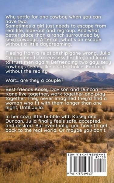 Why settle for one cowboy when you can have two. Sometimes a girl just needs to escape from real life, hide-out and regroup. And what better place than a ranch surrounded by sexy cowboys. After all, what's an escape without a little daydreaming. Fleeing from a relationship gone wrong, Julia Cragan needs to reassess her life, and learn to trust men again. Befriending two gay, sexy cowboys seems like a safe choice. Fantasy without the reality. Wait... are they a couple? Best friends Kasey Davison and Duncan Kane live together, work together and play together. They never imagined they'd find a woman who fit with them longer than one night. Until Julia. In her cozy little bubble with Kasey and Duncan, Julia finally feels safe, accepted, and desired. But eventually, you have to get back to the real world. Or maybe you don't.