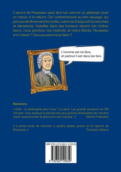 Le livre " Rousseau en 60 minutes " explique les fondements de sa pensée en s'appuyant sur de nombreuses citations. Il a eu son inspiration décisive alors qu'il se rendait chez son ami Diderot alors en prison. En marchant, il lisait le journal " Le Mercure de France ". Un concours appelait les lecteurs à répondre à la question de savoir si le progrès a contribué à améliorer les moeurs des hommes. Tous répondirent par oui. Sauf Rousseau. L'Homme, écrit-il, est bon par nature, ce n'est que par la civilisation qu'il est devenu mauvais. Il gagna grâce à sa thèse provocante et devint célèbre dans toute l'Europe. En effet, il fut le premier philosophe à avoir reconnu le problème du monde moderne. Alors que le bon sauvage déambulait encore en toute liberté dans les bois, nous passons notre vie dans des bureaux étriqués où nous avons perdu nos instincts et notre liberté. Mais surtout, critiquait Rousseau, l'homme moderne se fond dans le courant dominant. A-t-il raison ? Sommes-nous trop conformistes ? Et surtout : que pouvons-nous faire ? Le livre est paru dans la populaire à succès " Grands penseurs en 60 minutes ".