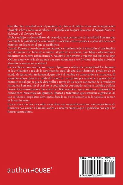 Este libro fue concebido con el propósito de ofrecer al público lector una interpretación plausible sobre las obras más valiosas del filósofo Jean Jacques Rousseau: el Segundo Discurso, el Emilio y el Contrato Social. Dichos trabajos se desarrollaron de acuerdo a una perspectiva de la realidad humana que nos brinda la posibilidad de comprender la sociedad contemporánea, a pesar del momento histórico tan lejano en el que se escribieron. Cuando Rousseau nos ofrece una mirada sobre el fenómeno de la alienación, el cual implica que el hombre vive fuera de sí mismo, alejado de su esencia, nos obliga a observarnos y evaluarnos en nuestra actual situación. Nosotros, los hombres y mujeres civilizados del siglo XXI, ¿Estamos viviendo de acuerdo a nuestra naturaleza o no? ¿Vivimos alienados o vivimos alineados a nuestro ser espiritual? En esta obra se van a ofrecer dos ensayos: el primero se refiere a la corrupción del ser humano en la civilización a raíz de la construcción social de una falsa identidad, producto de un estado de ignorancia fundamental, que privó al hombre de comprender su naturaleza. El segundo ensayo plantea la salida del estado de corrupción por medio de la gestación del contrato social que se puede desarrollar a través de un sujeto conocedor de la verdadera naturaleza humana, sin el cual no se podría haber concretado nunca la sociedad política democrática rousseauniana. Ese sujeto es el líder consciente que contribuye a desarrollar las condiciones intelectuales de igualdad, libertad y fraternidad que sustentan la gestación de una voluntad sociopolítica democrática basada en el conocimiento de la naturaleza común de la raza humana. Espero que estas dos tesis sobre estas obras tan sorprendentemente contemporáneas de Rousseau nos ayuden a iluminar vacíos y a resolver enigmas que el ginebrino nos legó a las futuras generaciones.