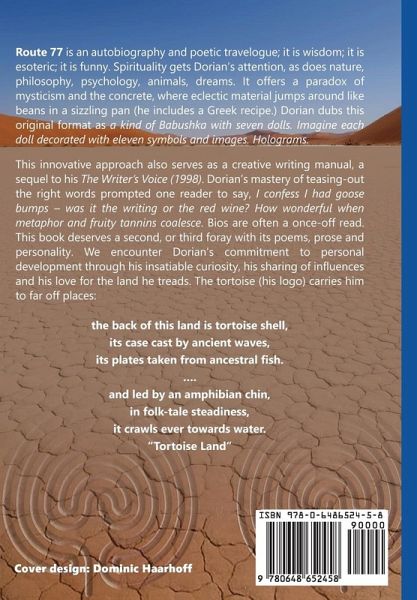 Route 77 is a biography and poetic travelogue; it is wisdom; it is esoteric; it is funny. Spirituality gets Dorian's attention, as does nature, philosophy, psychology, animals, dreams. It offers a paradox of mysticism and the concrete, where eclectic material jumps around like beans in a sizzling pan (he includes a Greek recipe.) Dorian dubs this original format as a kind of Babushka with seven dolls. Imagine each doll decorated with eleven symbols and images. Holograms. This innovative approach also serves as a creative writing manual, a sequel to his The Writer's Voice (1998). Dorian's mastery of teasing-out the right words prompted one reader to say, I confess I had goose bumps - was it the writing or the red wine? How wonderful when metaphor and fruity tannins coalesce. Bios are often a once-off read. This book deserves a second, or third foray with its poems, prose and personality. We encounter Dorian's commitment to personal development through his insatiable curiosity and his love for the land he treads. The tortoise (his logo) carries him to far off places: the back of this land is tortoise shell,its case cast by ancient waves,its plates taken from ancestral fish.....and led by an amphibian chin,in folk-tale steadiness,it crawls ever towards water.(Tortoise Land)