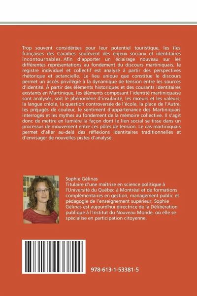 Trop souvent considérées pour leur potentiel touristique, les îles françaises des Caraïbes soulèvent des enjeux sociaux et identitaires incontournables. Afin d apporter un éclairage nouveau sur les différentes représentations au fondement du discours martiniquais, le registre individuel et collectif est analysé à partir des perspectives rhétorique et actancielle. Le lieu unique que constitue le discours permet un accès privilégié à la dynamique de tension entre les sources d identité. À partir des éléments historiques et des courants identitaires existants en Martinique, les éléments composant l identité martiniquaise sont analysés, soit le phénomène d insularité, les m urs et les valeurs, la langue créole, la question controversée de l école, la place de l Autre, les préjugés de couleur, le sentiment d appartenance des Martiniquais interrogés et les mythes au fondement de la mémoire collective. Il s agit donc de mettre en lumière la façon dont le lien social se tisse dans un processus de mouvement entre ces pôles de tension. Le cas martiniquais permet d aller au-delà des réflexions identitaires traditionnelles et d envisager de nouvelles pistes d analyse.