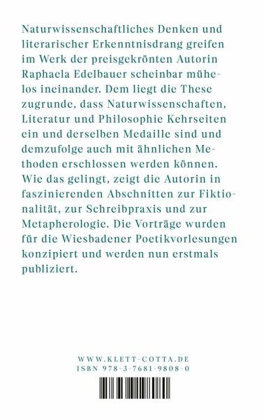 Im Werk von Raphaela Edelbauer greifen naturwissenschaftliches Denken und literarischer Erkenntnisdrang scheinbar mühelos ineinander. Dem liegt die These zugrunde, dass Naturwissenschaften, Literatur und Philosophie Kehrseiten ein und derselben Medaille sind und demzufolge auch mit ähnlichen Methoden erschlossen werden können. Wie das gelingt, zeigt die Autorin in faszinierenden Abschnitten zur Fiktionalität, zur Schreibpraxis und zur Metapherologie. Die Vorträge wurden für die Wiesbadener Poetikvorlesungen konzipiert und werden nun erstmals publiziert.