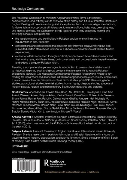 Aroosa Kanwal is Assistant Professor of English Literature at the International Islamic University, Pakistan. She is an author of Rethinking Identities in Contemporary Pakistani Fiction: Beyond 9/11 (2015), which was awarded the KLF-Coca-Cola award for the best non-fiction book of the year in 2015. Saiyma Aslam is Assistant Professor of English Literature at the International Islamic University, Pakistan. She is a researcher in postcolonial studies and English literature, with a focus on travelling theory, mobility, globalisation, and Islamic feminism. She is the author of From Stasis to Mobility: Arab Muslim Feminists and Travelling Theory (2017).