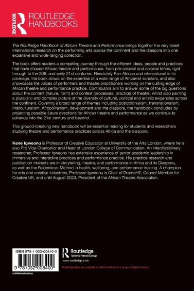 The Routledge Handbook of African Theatre and Performance brings together the latest international research on performing arts across the continent and the diaspora into one wide-ranging collection, offering readers a compelling journey through different ideas, people and practices which shape African theatre.