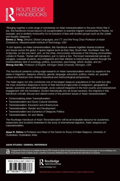 This handbook presents cutting-edge research on Asian transnationalism written by experts in the areas of migration, diaspora, ethnicity, gender, language, education, politics, media, art, popular culture and literature from diverse theoretical and methodological perspectives. The Asian region not only constitutes one of the largest diasporic populations in the world but also the most diversified diasporas in terms of their historical trajectories of emigration, geographical spread, economic and political strength, socio-cultural integration in the host country and transnational engagement with the homeland. Divided thematically into six broad sections, the chapters in this handbook critically discuss and debate some of the pertinent issues of Asian transnationalism: Contextualizing Asian Transnationalism Transnationalism and Socio-Cultural Identities Transnationalism, Education and Infrastructure Transnationalism, Gender and Development Transnationalism and Dynamics of Diasporic Politics Transnationalism, Art and Media The Routledge Handbook of Asian Transnationalism will be an invaluable resource for academics, researchers and students interested in the study of international migration, Asian diaspora and transnationalism. Chapter 29 of this book is available for free in PDF format as Open Access from the individual product page at www.routledge.com. It has been made available under a Creative Commons Attribution-Non Commercial-No Derivatives 4.0 license.