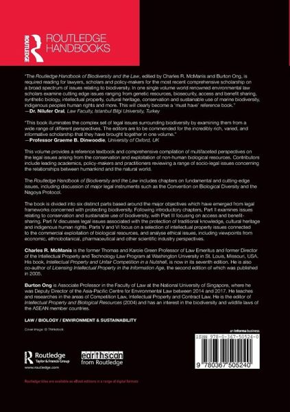"The Handbook of Biodiversity and the Law, edited by Charles R. McManis and Burton Ong, is required reading for lawyers, scholars and policymakers for the most recent comprehensive scholarship on a broad spectrum of issues relating to biodiversity. In one single volume world renowned environmental law scholars examine cutting edge issues ranging from genetic resources, biosecurity, access and benefit sharing, synthetic biology, intellectual property, cultural heritage, conservation and sustainable use of marine biodiversity, indigenous peoples human rights and more. This will clearly become a 'must have' reference book." - Dr. Nilufer Oral, Law Faculty, Istanbul Bilgi University, Turkey
