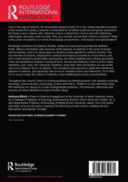 Routledge Handbook of Celebrity Studies, edited by acclaimed social theorist Anthony Elliott, offers a remarkably clear overview of the analysis of celebrity in the social sciences and humanities, and in so doing seeks to develop a new agenda for celebrity studies. The key theories of celebrity, ranging from classical sociological accounts to critical theory, and from media studies to postmodern approaches, are drawn together and critically appraised. There are substantive chapters looking at fame, renown and celebrity in terms of the media industries, pop music, the makeover industries, soap stars, fans and fandom as well as the rise of non-Western forms of celebrity. The Handbook also explores in detail the institutional aspects of celebrity, and especially new forms of mediated action and interaction. From Web 3.0 to social media, the culture of celebrity is fast redefining the public political sphere.
