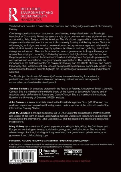 Containing contributions from academics, practitioners, and professionals, the Routledge Handbook of Community Forestry presents a truly global overview with case studies drawn from across Africa, Asia, Europe, and the Americas. The Handbook begins with an overview of the chapters and a discussion of the concept of community forestry and the key issues. Topics as wide-ranging as Indigenous forestry, conservation and ecosystem management, relationships with industrial forestry, trade and supply systems, land tenure and land grabbing, and climate change are addressed. The Handbook also focuses on governance, looking at the range of approaches employed, including multi-level governance and rights-based approaches, and the principal actors involved from local communities and Indigenous Peoples to governments and national and international non-governmental organisations. The Handbook reveals the importance of the historical context to community forestry and the effects of power and politics. Importantly, the Handbook not only focuses on successful examples of community forestry, but also addresses failures in order to highlight the key challenges we are still facing and potential solutions.