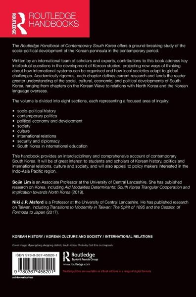The Routledge Handbook of Contemporary South Korea offers a ground-breaking study of the socio-political development of the Korean peninsula in the contemporary period. Written by an international team of scholars and experts, contributions to this book address key intellectual questions in the development of Korean studies, projecting new ways of thinking about how international systems can be organised and how local societies adapt to global challenges. Academically rigorous, each chapter defines current research and lends the reader greater understanding of the social, cultural, economic, and political developments of South Korea, ranging from chapters on the Korean Wave to relations with North Korea and the Korean language overseas. The volume is divided into eight sections, each representing a focused area of inquiry: socio-political history contemporary politics political economy and development society culture international relations security and diplomacy South Korea in international education This handbook provides an interdisciplinary and comprehensive account of contemporary South Korea. It will be of great interest to students and scholars of Korean history, politics and international relations, culture and society, and will also appeal to policy makers interested in the Indo-Asia Pacific region.