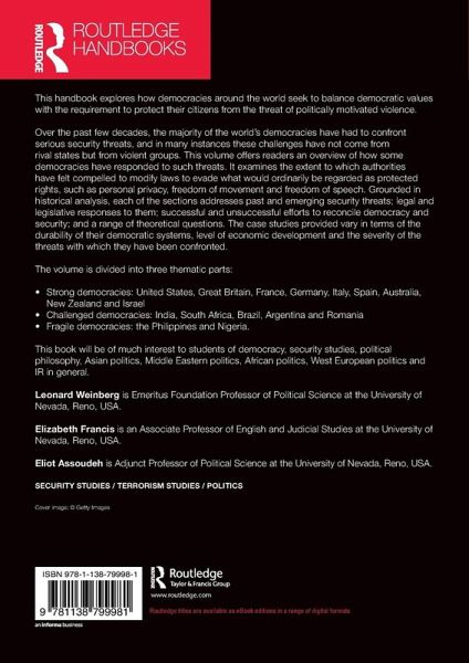 This handbook explores how democracies around the world seek to balance democratic values with the requirement to protect their citizens from the threat of politically motivated violence. Over the past few decades, the majority of the world's democracies have had to confront serious security threats, and in many instances these challenges have not come from rival states but from violent groups. This volume offers readers an overview of how some democracies have responded to such threats. It examines the extent to which authorities have felt compelled to modify laws to evade what would ordinarily be regarded as protected rights, such as personal privacy, freedom of movement and freedom of speech. Grounded in historical analysis, each of the sections addresses past and emerging security threats; legal and legislative responses to them; successful and unsuccessful efforts to reconcile democracy and security; and a range of theoretical questions. The case studies provided vary in terms of the durability of their democratic systems, level of economic development and the severity of the threats with which they have been confronted. The volume is divided into three thematic parts: Strong democracies: United States, Great Britain, France, Germany, Italy, Spain, Australia, New Zealand and Israel Challenged democracies: India, South Africa, Brazil, Argentina and Romania Fragile democracies: the Philippines and Nigeria. This book will be of much interest to students of democracy, security studies, political philosophy, Asian politics, Middle Eastern politics, African politics, West European politics and IR in general.
