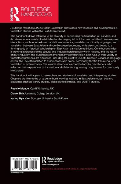 This handbook draws attention to the diversity of scholarship on translation in East Asia, and its relevance to a variety of established and emerging fields. It focuses on hitherto less-explored interactions, such as intra-Asian translation encounters, translation of minority languages, and translation between East Asian and non-European languages, while also contributing to a thriving body of historical scholarship on East Asian translation traditions. Contributions reflect a growing awareness of the cultural and linguistic heterogeneity within nations, and the reality of multilingualism and plurilingualism among many communities in East Asia. A wide variety of translatorial practices are discussed, including the creative use of Chinese in Japanese-language novels, the use of translation to evade censorship online, community theatre translation, and translation of picture books. The volume also includes contributions by practitioners, who reflect on their experiences of translation and of developing training programmes for community interpreters.