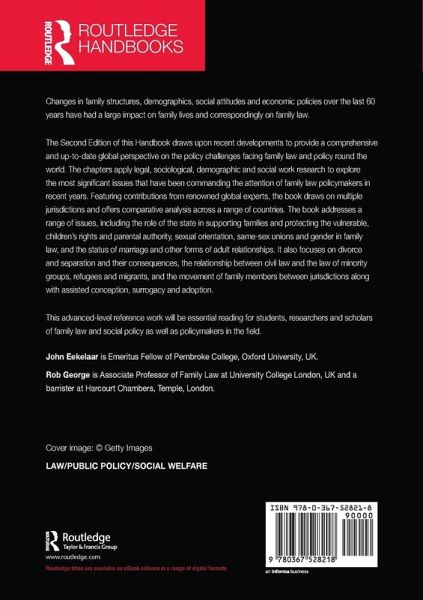 Changes in family structures, demographics, social attitudes and economic policies over the last 60 years have had a large impact on family lives and correspondingly on family law. The Second Edition of this Handbook draws upon recent developments to provide a comprehensive and up-to-date global perspective on the policy challenges facing family law and policy round the world. The chapters apply legal, sociological, demographic and social work research to explore the most significant issues that have been commanding the attention of family law policymakers in recent years. Featuring contributions from renowned global experts, the book draws on multiple jurisdictions and offers comparative analysis across a range of countries. The book addresses a range of issues, including the role of the state in supporting families and protecting the vulnerable, children's rights and parental authority, sexual orientation, same-sex unions and gender in family law, and the status of marriage and other forms of adult relationships. It also focuses on divorce and separation and their consequences, the relationship between civil law and the law of minority groups, refugees and migrants and the movement of family members between jurisdictions along with assisted conception, surrogacy and adoption. This advanced-level reference work will be essential reading for students, researchers and scholars of family law and social policy as well as policymakers in the field.
