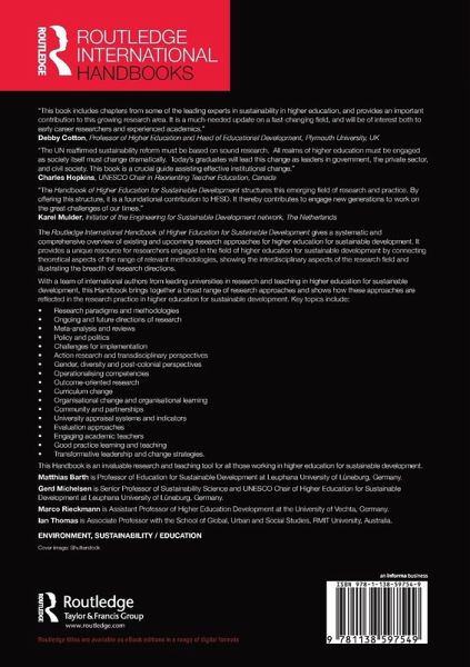 The Routledge International Handbook of Higher Education for Sustainable Development gives a systematic and comprehensive overview of existing and upcoming research approaches for higher education for sustainable development. It provides a unique resource for researchers engaged in the field of higher education for sustainable development by connecting theoretical aspects of the range of relevant methodologies, showing the interdisciplinary aspects of the research field and illustrating the breadth of research directions. With a team of international authors from leading universities in research and teaching in higher education for sustainable development this Handbook brings together a broad range of research approaches and shows how these approaches are reflected in the research practice in higher education for sustainable development. Key topics include: Research Paradigms and Methodologies Ongoing and Future Directions of Research Meta-Analysis and Reviews Policy and Politics Challenges for Implementation Action Research and Transdisciplinary Perspective Gender, Diversity and Post-Colonial Perspectives Operationalising Competencies Outcome-Oriented Research Curriculum Change Organisational Change and Organisational Learning Community and Partnerships University Appraisal Systems and Indicators Evaluation Approaches Engaging Academic Teachers Good Practice Learning and Teaching Transformative Leadership and Change Strategies This Handbook is an invaluable research and teaching tool for all those working in higher education for sustainable development.