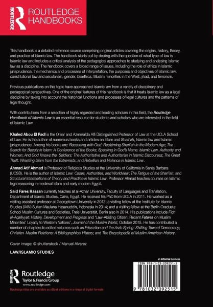 This handbook is a detailed reference source comprising original articles covering the origins, history, theory and practice of Islamic law. The handbook starts out by dealing with the question of what type of law is Islamic law and includes a critical analysis of the pedagogical approaches to studying and analysing Islamic law as a discipline. The handbook covers a broad range of issues, including the role of ethics in Islamic jurisprudence, the mechanics and processes of interpretation, the purposes and objectives of Islamic law, constitutional law and secularism, gender, bioethics, Muslim minorities in the West, jihad and terrorism.