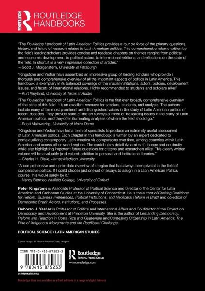 The richness and diversity of the study of Latin American politics makes it hard to stay abreast of the developments in the many sub-literatures of the field. The Routledge Handbook of Latin American Politics offers an intellectually rigorous overview of the state of the field and a thoughtful guide to the direction of future scholarship. Kingstone and Yashar bring together the leading figures in the study of Latin Americato present extensive empirical coverage, new original research, and a cutting-edge examination of the central areas of inquiry in the region.