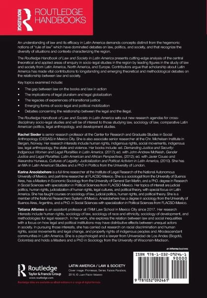 An understanding of law and its efficacy in Latin America demands concepts distinct from the hegemonic notions of "rule of law" which have dominated debates on law, politics and society, and that recognize the diversity of situations and contexts characterizing the region. The Routledge Handbook of Law and Society in Latin America presents cutting-edge analysis of the central theoretical and applied areas of enquiry in socio-legal studies in the region by leading figures in the study of law and society from Latin America, North America and Europe. Contributors argue that scholarship about Latin America has made vital contributions to longstanding and emerging theoretical and methodological debates on the relationship between law and society. Key topics examined include: The gap between law-on-the-books and law in action The implications of legal pluralism and legal globalization The legacies of experiences of transitional justice Emerging forms of socio-legal and political mobilization Debates concerning the relationship between the legal and the illegal. The Routledge Handbook of Law and Society in Latin America sets out new research agendas for cross-disciplinary socio-legal studies and will be of interest to those studying law, sociology of law, comparative Latin American politics, legal anthropology and development studies.