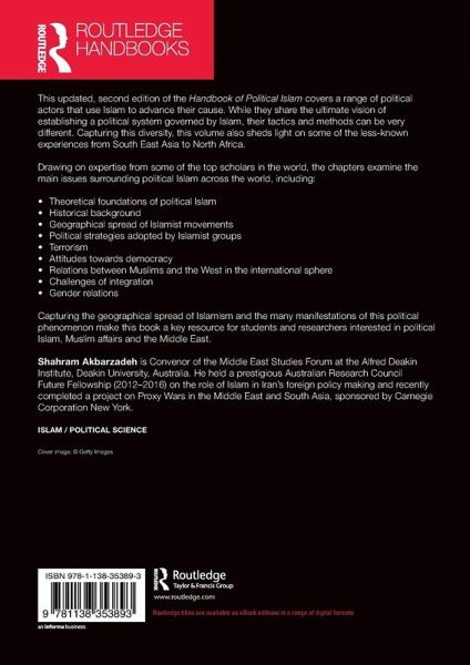 This updated, second edition of the Handbook of Political Islam covers a range of political actors that use Islam to advance their cause. While they share the ultimate vision of establishing a political system governed by Islam, their tactics and methods can be very different. Capturing this diversity, this volume also sheds light on some of the less-known experiences from South East Asia to North Africa. Drawing on expertise from some of the top scholars in the world, the chapters examine the main issues surrounding political Islam across the world, including: Theoretical foundations of political Islam Historical background Geographical spread of Islamist movements Political strategies adopted by Islamist groups Terrorism Attitudes towards democracy Relations between Muslims and the West in the international sphere Challenges of integration Gender relations Capturing the geographical spread of Islamism and the many manifestations of this political phenomenon make this book a key resource for students and researchers interested in political Islam, Muslim affairs and the Middle East.