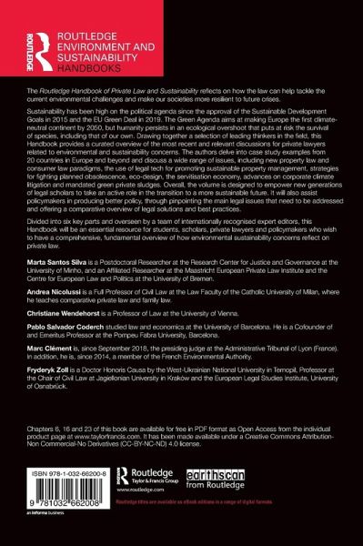 Sustainability has been high on the political agenda since the approval of the Sustainable Development Goals in 2015 and the EU Green Deal in 2019. The Green Agenda aims at making Europe the first climate neutral continent by 2050, but humanity persists in an ecological overshoot that puts at risk the survival of species, including that of our own. Drawing together a selection of leading thinkers in the field, this Handbook provides a curated overview of the most recent and relevant discussions for private lawyers related to environmental and sustainability concerns. The authors delve into case study examples from 20 countries in Europe and beyond and discuss a wide range of issues, including new property law and consumer law paradigms, the use of legal tech for promoting sustainable property management, strategies for fighting planned obsolescence, eco design, the servitisation economy, advances on corporate climate litigation and mandated green private sludges. Overall, the volume is designed to empower new generations of legal scholars to take an active role in the transition to a more sustainable future. It will also assist policymakers in producing better policy, through pinpointing the main legal issues that need to be addressed and offering a comparative overview of legal solutions and best practices.