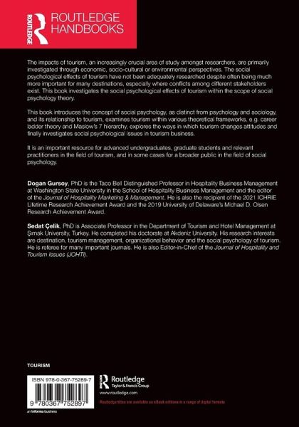 The impacts of tourism, an increasingly crucial area of study amongst researchers, are primarily investigated through economic, socio-cultural or environmental perspectives. The social psychological effects of tourism have not been adequately researched despite often being much more important for many destinations, especially where conflicts among different stakeholders exist. This book investigates the social psychological effects of tourism within the scope of social psychology theory.