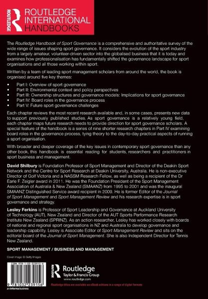 The Routledge Handbook of Sport Governance is a comprehensive and authoritative survey of the wide range of issues shaping sport governance. It considers the evolution of the sport industry from a largely amateur, volunteer-driven sector into the globalised business that it is today and examines how professionalisation has fundamentally shifted the governance landscape for sport organisations and all those working within sport. Written by a team of leading sport management scholars from around the world, the book is organised around five key themes: Part I: Overview of sport governance Part II: Environmental context and policy perspectives Part III: Ownership structures and governance models: Implications for sport governance Part IV: Board roles in the governance process Part V: Future sport governance challenges Each chapter reviews the most recent research available and, in some cases, presents new data to support previously published studies. As sport governance is a relatively young field, each chapter maps future research needs to provide direction for sport governance scholars. A special feature of the handbook is a series of nine shorter research chapters in Part IV examining board roles in the governance process, tying theory to the day-to-day practical aspects of running a sport organisation. With broader and deeper coverage of the key issues in contemporary sport governance than any other book, this handbook is essential reading for students, researchers and practitioners in sport business and management.