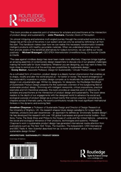 As a cultivated form of invention, product design is a deeply human phenomenon that enables us to shape, modify and alter the world around us - for better or worse. The recent emergence of the sustainability imperative in product design compels us to recalibrate the parameters of good design in an unsustainable age. Written by designers, for designers, the Routledge Handbook of Sustainable Product Design presents the first systematic overview of the burgeoning field of sustainable product design. Brimming with intelligent viewpoints, critical propositions, practical examples and rich theoretical analyses, this book provides an essential point of reference for scholars and practitioners at the intersection of product design and sustainability. The book takes readers to the depth of our engagements with the designed world to advance the social and ecological purpose of product design as a critical twenty-first-century practice. Comprising 35 chapters across 6 thematic parts, the book's contributors include the most significant international thinkers in this dynamic and evolving field.