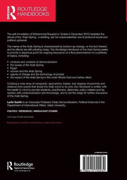 The self-immolation of Mohammed Bouazizi in Tunisia in December 2010 heralded the arrival of the 'Arab Spring,' a startling, yet not unprecedented, era of profound social and political upheaval. The meme of the Arab Spring is characterised by bottom-up change, or the lack thereof, and its effects are still unfurling today. The Routledge Handbook of the Arab Spring seeks to provide a departure point for ongoing discussion of a fluid phenomenon on a plethora of topics, including: Contexts and contests of democratisation The sweep of the Arab Spring Egypt Women and the Arab Spring Agents of change and the technology of protest Impact of the Arab Spring in the wider Middle East and further afield Collating a wide array of viewpoints, specialisms, biases, and degrees of proximity and distance from events that shook the Arab world to its core, the Handbook is written with the reader in mind, to provide students, practitioners, diplomats, policy-makers and lay readers with contextualization and knowledge, and to set the stage for further discussion of the Arab Spring.