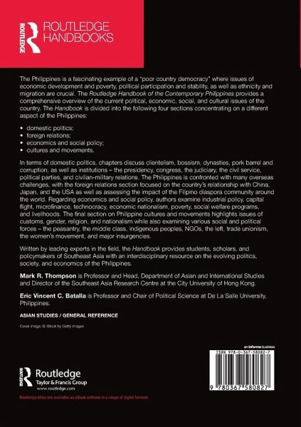 The Philippines is a fascinating example of a "poor country democracy" where issues of economic development and poverty, political participation and stability, as well as ethnicity and migration are crucial. The Routledge Handbook of the Contemporary Philippines provides a comprehensive overview of the current political, economic, social, and cultural issues of the country. The Handbook is divided into the following four sections concentrating on a different aspect of the Philippines: domestic politics; foreign relations; economics and social policy; cultures and movements. In terms of domestic politics, chapters discuss clientelism, bossism, dynasties, pork barrel and corruption as well as institutions - the presidency, congress, the judiciary, the civil service, political parties, and civilian-military relations. The Philippines is confronted with many overseas challenges, with the foreign relations section focused on the country's relationship with China, Japan, and the USA as well as assessing the impact of the Filipino diaspora community around the world. Regarding economics and social policy, authors examine industrial policy, capital flight, microfinance, technocracy, economic nationalism, poverty, social welfare programs, and livelihoods. The final section on Philippine cultures and movements highlights issues of customs, gender, religion, and nationalism while also examining various social and political forces - the peasantry, the middle class, indigenous peoples, NGOs, the left, trade unionism, the women's movement, and major insurgencies. Written by leading experts in the field, the Handbook provides students, scholars, and policymakers of Southeast Asia with an interdisciplinary resource on the evolving politics, society, and economics of the Philippines.