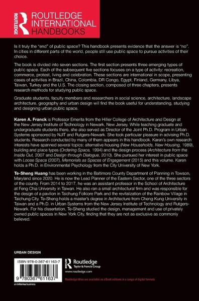 Karen A. Franck is Professor Emerita from the Hillier College of Architecture and Design at the New Jersey Institute of Technology in Newark, New Jersey. While teaching graduate and undergraduate students there, she also served as Director of the Joint Ph.D. Program in Urban Systems sponsored by NJIT and Rutgers-Newark. She took particular pleasure in advising Ph.D. students. Research conducted by many of them appears in this handbook. Karen's own research interests have spanned several topics: alternative housing (New Households, New Housing, 1989), building and place types (Ordering Space, 1994) and the design process (Architecture from the Inside Out, 2007 and Design through Dialogue, 2010). She pursued her interest in public space with Loose Space (2007), Memorials as Spaces of Engagement (2015) and this volume. Karen holds a Ph.D. in Environmental Psychology from the City University of New York. Te-Sheng Huang has been working in the Baltimore County Department of Planning in Towson, Maryland since 2020. He is now the Lead Planner of the Eastern Sector, one of the three sectors of the county. From 2014 to 2017, he was an assistant professor in the School of Architecture at Feng Chia University in Taiwan. He also ran a small architectural firm and was responsible for the design of a pavilion in Taichung Folklore Park and the revitalization of the Rainbow Village in Taichung City. Te-Sheng holds a master's degree in Architecture from Cheng Kung University in Taiwan and a Ph.D. in Urban Systems from the New Jersey Institute of Technology and Rutgers-Newark. For his dissertation, Te-Sheng studied the design, management and use of privately owned public spaces in New York City, finding that they are not as exclusive as commonly believed.