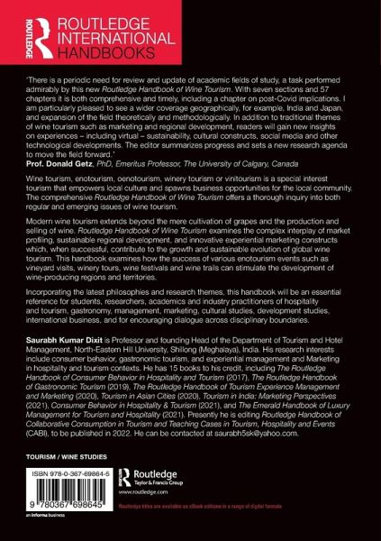 'There is a periodic need for review and update of academic fields of study, a task performed admirably by this new Routledge Handbook of Wine Tourism. With seven sections and 57 chapters it is both comprehensive and timely, including a chapter on post-Covid implications. I am particularly pleased to see a wider coverage geographically, for example, India and Japan, and expansion of the field theoretically and methodologically. In addition to traditional themes of wine tourism such as marketing and regional development, readers will gain new insights on experiences - including virtual - sustainability, cultural constructs, social media and other technological developments. The editor summarizes progress and sets a new research agenda to move the field forward.'- Prof. Donald Getz, PhD, Emeritus Professor, The University of Calgary, Canada