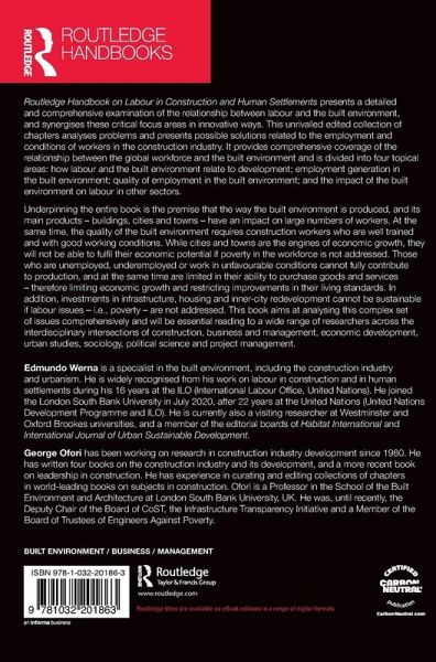Routledge Handbook on Labour in Construction and Human Settlements presents a detailed and comprehensive examination of the relationship between labour and the built environment, and synergises these critical focus areas in innovative ways. This unrivalled edited collection of chapters analyses problems and presents possible solutions related to the employment and conditions of workers in the construction industry. It provides comprehensive coverage of the relationship between the global workforce and the built environment and is divided into four topical areas: how labour and the built environment relate to development; employment generation in the built environment; quality of employment in the built environment; and the impact of the built environment on labour in other sectors.