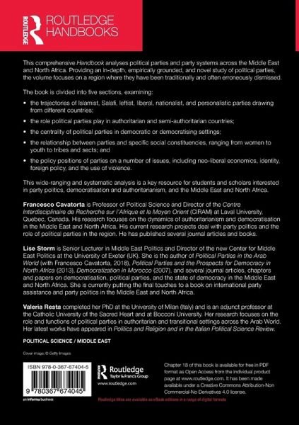 This comprehensive Handbook analyses the political parties and party systems across the Middle East and North Africa. Providing an in-depth, empirically grounded and novel study of political parties, the volume focuses on a region where they have been traditionally and often erroneously dismissed.