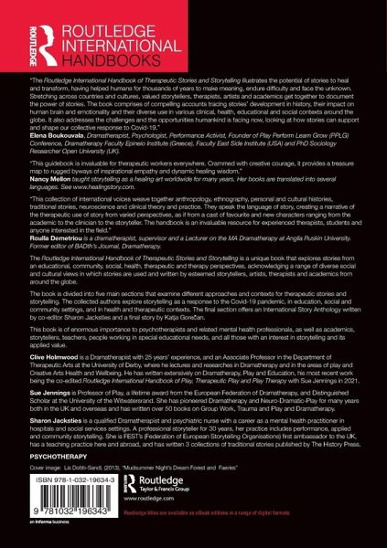 "The Routledge International Handbook of Therapeutic Stories and Storytelling illustrates the potential of stories to heal and transform, having helped humans for thousands of years to make meaning, endure difficulty and face the unknown. Stretching across countries and cultures, valued storytellers, therapists, artists and academics get together to document the power of stories. The book comprises of compelling accounts tracing stories' development in history, their impact on human brain and emotionality and their diverse use in various clinical, health, educational and social contexts around the globe. It also addresses the challenges and the opportunities humankind is facing now, looking at how stories can support and shape our collective response to Covid 19." - Elena Boukouvala, Dramatherapist, Psychologist, Performance Activist, Founder of Play Perform Learn Grow (PPLG) Conference, Dramatherapy Faculty Epineio Institute (Greece), Faculty East Side Institute (USA) and PhD Sociology Researcher Open University (UK).