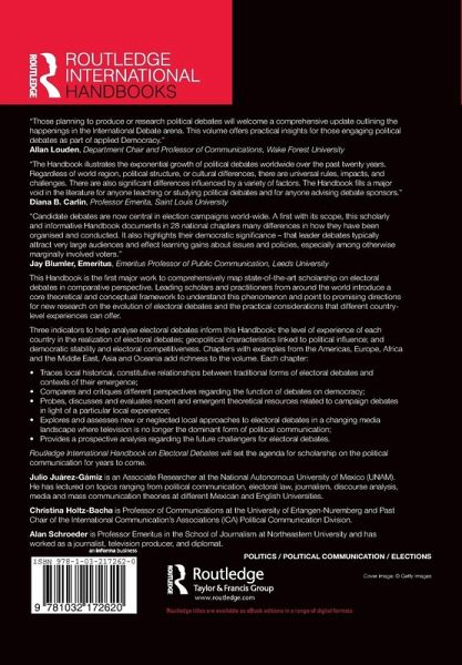 This Handbook is the first major work to comprehensively map state-of-the-art scholarship on electoral debates in comparative perspective. Leading scholars and practitioners from around the world introduce a core theoretical and conceptual framework to understand this phenomenon and point to promising directions for new research on the evolution of electoral debates and the practical considerations that different country-level experiences can offer. Three indicators to help analyze electoral debates inform this Handbook: the level of experience of each country in the realization of electoral debates; geopolitical characteristics linked to political influence; and democratic stability and electoral competitiveness. Chapters with examples from the Americas, Europe, Africa and the Middle East, Asia and Oceania add richness to the volume. Each chapter: Traces local historical, constitutive relationships between traditional forms of electoral debates and contexts of their emergence; Compares and critiques different perspectives regarding the function of debates on democracy; Probes, discusses and evaluates recent and emergent theoretical resources related to campaign debates in light of a particular local experience; Explores and assesses new or neglected local approaches to electoral debates in a changing media landscape where television is no longer the dominant form of political communication; Provides a prospective analysis regarding the future challengers for electoral debates. The Routledge International Handbook on Electoral Debates will set the agenda for scholarship on the political communication for years to come.