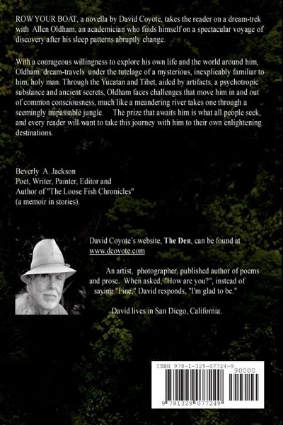 ROW YOUR BOAT, a novella by David Coyote, takes the reader on a dream-trek with Allen Oldham, an academician who finds himself on a spectactular voyage of discovery after his sleep patterns abruptly change. With a courageous willingness to explore his own life and the world around him, Oldham dream-travels under the tutelage of a mysterious, inexplicably familiar to him, holy man. Through the Yucatan and Tibet, aided by artifacts, a psychotropic substance and ancient secrets, Oldham faces challenges that move him in and out of common consciousness, much like a meandering river takes one through a seemingly impassable jungle. The prize that awaits him is what all people seek, and every reader will want to take this journey with him to their own enlightening destinations. Beverly A. Jackson Poet, Writer, Painter, Editor and Author of "The Loose Fish Chronicles" (a memoir in stories)