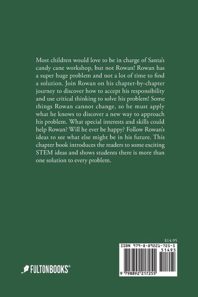 Most children would love to be in charge of Santa's candy cane workshop, but not Rowan! Rowan has a super huge problem and not a lot of time to find a solution. Join Rowan on his chapter-by-chapter journey to discover how to accept his responsibility and use critical thinking to solve his problem! Some things Rowan cannot change, so he must apply what he knows to discover a new way to approach his problem. What special interests and skills could help Rowan? Will he ever be happy? Follow Rowan's ideas to see what else might be in his future. This chapter book introduces the readers to some exciting STEM ideas and shows students there is more than one solution to every problem.