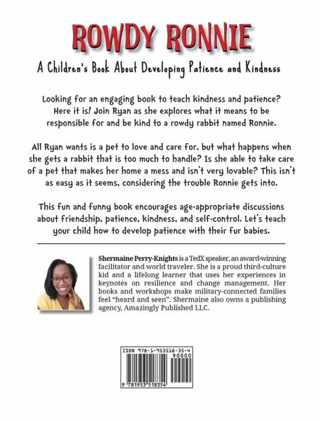 Looking for an engaging book to teach kindness and patience? Here it is! Join Ryan as she explores what it means to be responsible for and be kind to a rowdy rabbit named Ronnie. All Ryan wants is a pet to love and care for, but what happens when she gets a rabbit that is too much to handle? Is she able to take care of a pet that makes her home a mess and isn't very lovable? This isn't as easy as it seems, considering the trouble Ronnie gets into. This patience book for kids ...Encourages age-appropriate discussions about patience, kindness, and self-control An engaging story about the virtue of patience and being responsible for a pet Perfect for early readers ages 4-8, reading out loud at home or in a classroom Perfect for back-to-school reading, summer reading, birthday gifts, and holiday gift-giving Excellent resource for educators, parents, and teachers alike Let's teach your child how to develop patience with their fur babies.