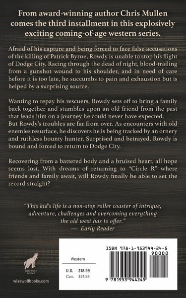 From award-winning author Chris Mullen comes the third installment in this explosively exciting coming-of-age western series. Afraid of his capture and being forced to face false accusations of the killing of Patrick Byrne, Rowdy is unable to stop his flight of Dodge City. Racing through the dead of night, blood-trailing from a gunshot wound to his shoulder, and in need of care before it is too late, he succumbs to pain and exhaustion but is helped by a surprising source. Wanting to repay his rescuers, Rowdy sets off to bring a family back together and stumbles upon an old friend from the past that leads him on a journey he could never have expected. But Rowdy's troubles are far from over. As encounters with old enemies resurface, he discovers he is being tracked by an ornery and ruthless bounty hunter. Surprised and betrayed, Rowdy is bound and forced to return to Dodge City. Recovering from a battered body and a bruised heart, all hope seems lost. With dreams of returning to "Circle R" where friends and family await, will Rowdy finally be able to set the record straight? "This kid's life is a non-stop roller coaster of intrigue, adventure, challenges and overcoming everything the old west has to offer"- Early Reader