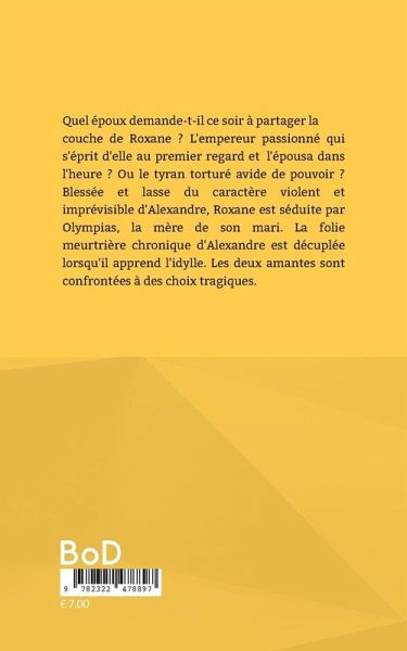 Quel époux demande-t-il ce soir à partager la couche de Roxane ? L'empereur passionné qui s'éprit d'elle au premier regard et l'épousa dans l'heure ? Ou le tyran torturé avide de pouvoir ? Blessée et lasse du caractère violent et imprévisible d'Alexandre, Roxane est séduite par Olympias, la mère de son mari. La folie meurtrière chronique d'Alexandre est décuplée lorsqu'il apprend l'idylle. Les deux amantes sont confrontées à des choix tragiques.