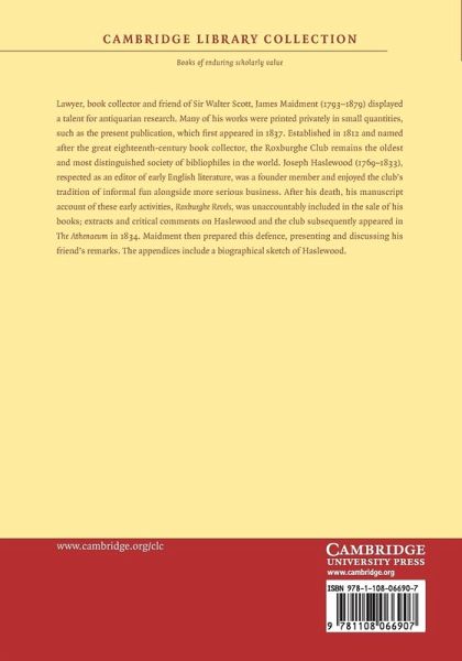 Lawyer, book collector and friend of Sir Walter Scott, James Maidment (1793-1879) displayed a talent for antiquarian research. Many of his works were printed privately in small quantities, such as the present publication, which first appeared in 1837. Established in 1812 and named after the great eighteenth-century book collector, the Roxburghe Club remains the oldest and most distinguished society of bibliophiles in the world. Joseph Haslewood (1769-1833), respected as an editor of early English literature, was a founder member and enjoyed the club's tradition of informal fun alongside more serious business. After his death, his manuscript account of these early activities, Roxburghe Revels, was unaccountably included in the sale of his books; extracts and critical comments on Haslewood and the club subsequently appeared in The Athenaeum in 1834. Maidment then prepared this defence, presenting and discussing his friend's remarks. The appendices include a biographical sketch of Haslewood.