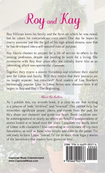 Roy Hillman loves his family and the farm on which he was raised, but he values his independence even more. One day he hopes to marry someone just like the girl of his high school dreams, now that he has developed into a self-assured man of purpose. Kay Harris chooses to prepare for a life of service to others in the nursing profession, despite not needing to work for a living. She reconnects with Roy four years after she initially knew him as an interesting, albeit non-spectacular, classmate. Together, they renew a sincere friendship and reinforce their shared love for Litton and family. Will they realize that their journeys are no longer separate but entwined? Avid readers of Lisa Smelter's increasingly popular Love in Litton Series now discover how it all began in Roy and Kay - The Beginning.