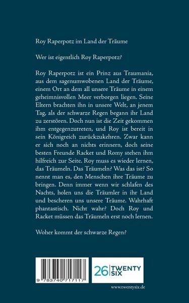 Roy Raperpotz im Land der TräumeWer ist eigentlich Roy Raperpotz?Roy Raperpotz ist ein Prinz aus Traumania, aus dem sagenumwobenen Land der Träume, einem Ort an dem all unsere Träume in einem geheimnisvollen Meer verborgen liegen. Seine Eltern brachten ihn in unsere Welt, an jenem Tag, als der schwarze Regen begann ihr Land zu zerstören. Doch nun ist die Zeit gekommen ihm entgegenzutreten, und Roy ist bereit in sein Königreich zurückzukehren. Zwar kann er sich noch an nichts erinnern, doch seine besten Freunde Racket und Romy stehen ihm hilfreich zur Seite. Roy muss es wieder lernen, das Träumeln. Das Träumeln? Was das ist? So nennt man es, den Menschen ihre Träume zu bringen. Denn immer wenn wir schlafen des Nachts, holen uns die Träumler in ihr Land und bescheren uns unsere Träume. Wahrhaft phantastisch. Nicht wahr? Doch Roy und Racket müssen das Träumeln erst noch lernen. Woher kommt der schwarze Regen?