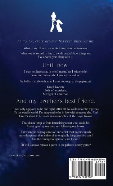 All my life, every decision has been made for me. What to say. How to dress. And now, who I'm to marry. When you're second in line to the throne, it's just how things are. I've always gone along with it. Until now. I may not have a say in who I marry, but I refuse to let someone dictate who I give my v-card to. So I offer it to the only man I trust not to go to the paparazzi. Creed Lawson. Body of an Adonis. Strength of a warrior. And my brother's best friend. It was only supposed to be one night. To the outside world, I'm supposed to be in love with someone else. And Creed's about to be sworn in as a member of the Royal Guard. That doesn't stop us from fantasizing about what could be. About ignoring our duty and following our hearts. But when the consequences of our secret tryst become much more dangerous than either of us originally bargained for, can I find the courage to fight for what I want? Or will I always remain a pawn in the palace's deadly game?