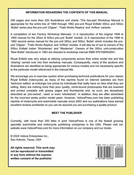 206 pages and more than 200 illustrations and charts, size 8.25 x 10.75 inches. This two-part Workshop Manual is appropriate for the entire line of 1948 through 1962 pre-unit Royal Enfield 350cc and 500cc 'Bullet' series plus the pre-unit 'Clipper', 'Trials Works Replica' and 'Airflow' variants. A compilation of two Factory Workshop Manuals: 1) A reproduction of the original 1948 to 1955 manual for the 350cc & 500cc pre-unit 'Bullet' models. 2) A reproduction of the 1956 to 1962 second series manual for the pre-unit 350cc and 500cc 'Bullet' which includes the pre-unit 'Clipper', 'Trials Works Replica' and 'Airflow' models. It will also be of use to owners of the 500cc Enfield Indian 'Woodsman' and 'Westerner'. Owners of the 350cc unit-construction 'New Bullet' introduced in 1963 are directed to workshop manual ISBN 9781588502841. Royal Enfield was very adept at utilizing components across their entire model line and this 'sharing' carried over into their workshop manuals. Consequently, many of the sections and illustrations are identified as being appropriate for various models and not necessarily specific to the particular model referenced in the manual title. We encourage you to exercise caution when purchasing technical publications for your classic Royal Enfield motorcycles as many of the reprints found on internet websites are from 'bedroom sellers' at enticingly low prices by individuals that really have no idea what they are selling. Many are nothing more than poor quality, comb-bound photocopies that are scanned and printed complete with greasy pages and thumbprints and, as such, are deceptively described as 'pre-owned', 'used' or even 'refurbished'. In addition, they are often advertised for the incorrect series and/or model years. However, VelocePress.com has been publishing reprints of motorcycle and automobile manuals since 2003 and our publications have earned excellent reviews worldwide so you can be assured you are purchasing a quality product.