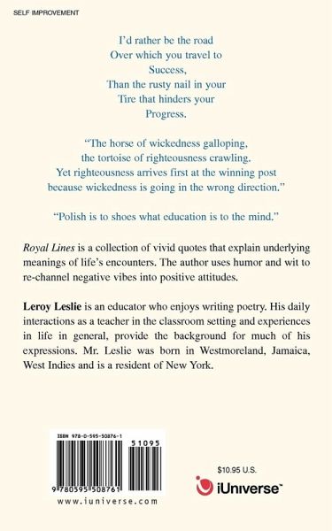 "Don't drag me into An ugliness match! The last time I looked Into a mirror I could see clearly, I won't win!" "The horse of wickedness galloping, the tortoise of righteousness crawling. Yet righteousness arrives first at the winning post because wickedness is going in the wrong direction." "Polish is to shoes what education is to the mind." Royal Lines is a collection of vivid quotes, that explain underlying meanings of life's encounters. The author uses humor and wit to re-channel negative vibes into positive attitudes.