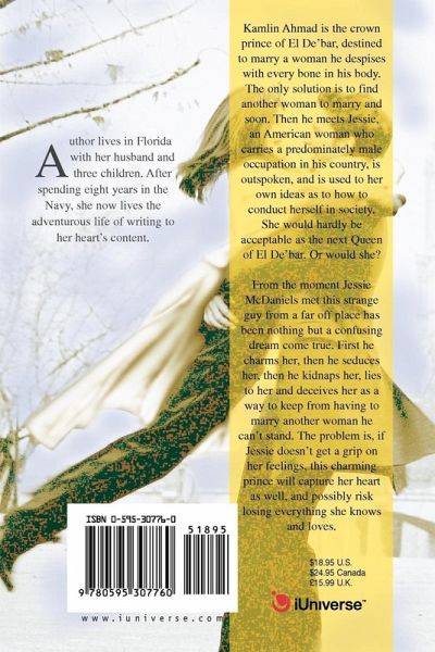 Kamlin Ahmad is the crown prince of El De'bar, destined to marry a woman he despises with every bone in his body. The only solution is to find another woman to marry and soon. Then he meets Jessie, an American woman who carries a predominately male occupation in his country, is outspoken, and is used to her own ideas as to how to conduct herself in society. She would hardly be acceptable as the next Queen of El De'bar. Or would she? From the moment Jessie McDaniels met this strange guy from a far off place has been nothing but a confusing dream come true. First he charms her, then he seduces her, then he kidnaps her, lies to her and deceives her as a way to keep from having to marry another woman he can't stand. The problem is, if Jessie doesn't get a grip on her feelings, this charming prince will capture her heart as well, and possibly risk losing everything she knows and loves.
