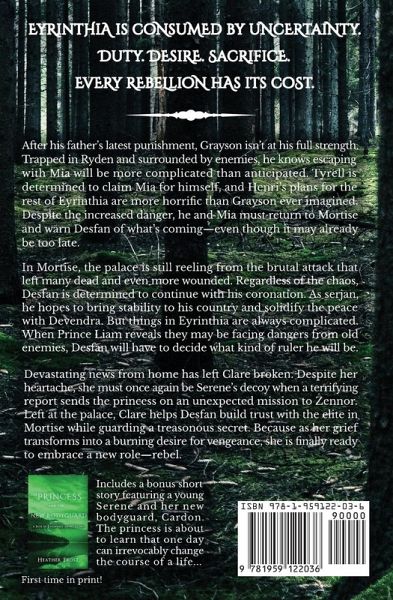 A PRINCE fighting to save a princess A SERJAH torn between duty and desire A PRINCESS willing to sacrifice everything A DECOY with nothing to lose A WORLD about to be torn apart After his father's latest punishment, Grayson isn't at his full strength. Trapped in Ryden and surrounded by enemies, he knows escaping with Mia will be more complicated than anticipated. Tyrell is determined to claim Mia for himself, and Henri's plans for the rest of Eyrinthia are more horrific than Grayson ever imagined. Despite the increased danger, he and Mia must return to Mortise and warn Desfan of what's coming-even though it may already be too late. In Mortise, the palace is still reeling from the brutal attack that left many dead and even more wounded. Regardless of the chaos, Desfan is determined to continue with his coronation. As serjan, he hopes to bring stability to his country and solidify the peace with Devendra. But things in Eyrinthia are always complicated. When Prince Liam reveals they may be facing dangers from old enemies, Desfan will have to decide what kind of ruler he will be. Devastating news from home has left Clare broken. Despite her heartache, she must once again be Serene's decoy when a terrifying report sends the princess on an unexpected mission to Zennor. Left at the palace, Clare helps Desfan build trust with the elite in Mortise while guarding a treasonous secret. Because as her grief transforms into a burning desire for vengeance, she is finally ready to embrace a new role-rebel. Eyrinthia is consumed by uncertainty. Duty. Desire. Sacrifice. Every rebellion has its cost. Royal Rebel is book 4 in the Fate of Eyrinthia YA fantasy romance series, and should be read in order. If you like swoon-worthy romance, complex characters, and non-stop action with epic twists, then you'll love the captivating world of Eyrinthia! ¿¿***The paperback version includes a bonus short story, "The Princess and the New Bodyguard", featuring a young Serene and her new bodyguard, Cardon. The princess is about to learn that one day can irrevocably change the course of a life...***