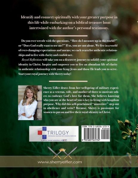 Identify and connect spiritually with your greater purpose in this life while embarking on a biblical treasure hunt intertwined with the author's personal testimony. Do you ever wrestle with the questions, "How do I measure up in this world?" or "Does God really want to use me?" If so, you are not alone. We live in a world of ever-changing expectations and norms; we each yearn for authentic relationships and to live with clarity and confidence. Royal Reflections will take you on a discovery journey to solidify your spiritual identity in Christ. Inspire and empower you to live an abundant life of clarity in authentic relationship with your King Jesus and those He leads you to serve. Start your royal journey with Sherry today!