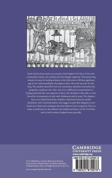 Much ink has been spent on accounts of the English Civil Wars of the mid-seventeenth century yet royalism has been largely neglected. This pioneering volume of essays by leading scholars in the field seeks to fill that significant gap in our understanding by focusing on those who took up arms for the king. The royalists described were not reactionary, absolutist extremists but pragmatic, moderate men who were not so different in temperament or background from the vast majority of those who decided to side with, or were forced by circumstances to side with, Parliament and its army. The essays force us to think beyond the simplistic dichotomy between royalist 'absolutists' and 'constitutionalists' and suggest instead that allegiances were much more fluid and contingent than has hitherto been recognized. This is a major contribution to the political and intellectual history of the Civil Wars and of early modern England more generally.