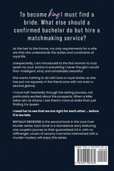 To become king I must find a bride. What else should a confirmed bachelor do but hire a matchmaking service? As the heir to the throne, my only requirements for a wife are that she understands the duties and constraints of royal life. Unexpectedly, I am introduced to the first woman to truly spark my soul. Ariana is everything I never thought I would find-intelligent, kind, and remarkably beautiful. She wants nothing to do with love or royal duties, so she has put me squarely in the friend zone with not even a second glance. I move half-heartedly through the dating process, not particularly excited about the prospects. When a killer takes aim at Ariana, I see there's more at stake than just finding my queen. I need her to see that we are right for each other ... before it is too late. ROYALLY DECEIVED is the second book in the Love Over Murder series. Each book is a standalone story featuring one couple's journey to their guaranteed H.E.A. with no cliffhanger. Lovers of swoony moments intertwined with a murder mystery will enjoy this series.